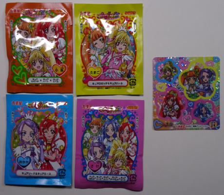 バンダイのドキドキプリキュアチョコスナック3。 今回の過去作からの再録分は割りと均等にバラけた印象。 |