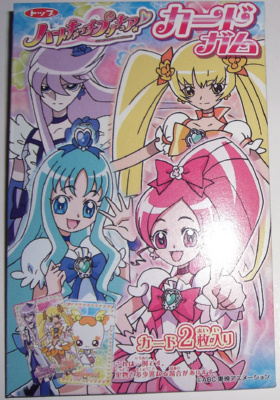 トップ製菓のハートキャッチプリキュアカードガム。 中のカードは42種類あるのですが、私の場合はパッケージと同じ絵柄でした。 運がいいんだか悪いんだか。 |