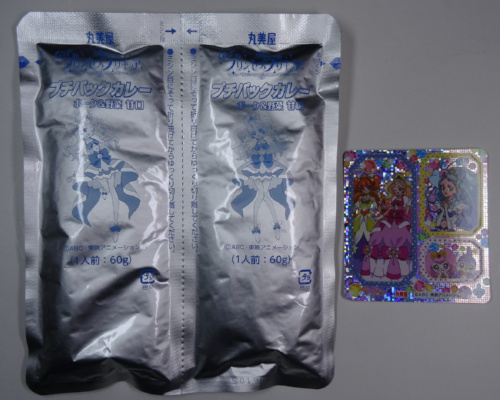 丸美屋のプリンセスプリキュアプチパックカレー。 番組が終わりそうな時期になってようやく購入。 なんか近所のスーパーは後期商品の入りが悪いような? |