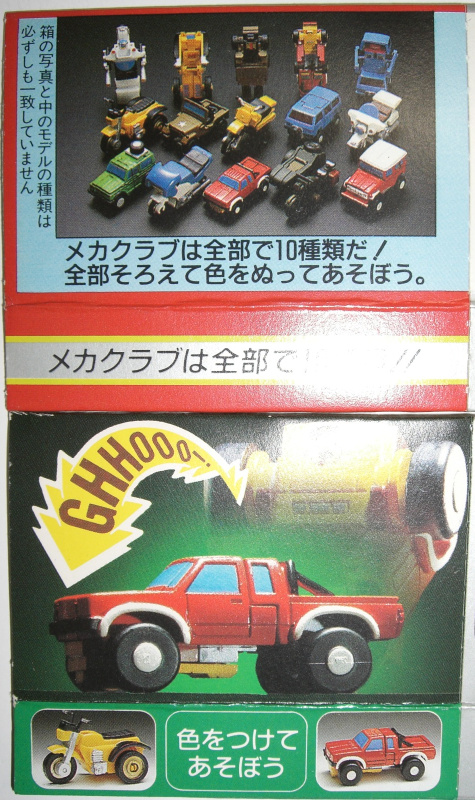 ラインナップは全10種。 4WDロボ、オフロードロボ、ワイルドロボ、 RVロボ、ピックアップロボ、 レーサーロボ、モトクロスロボ、パトロールロボ、 バギーロボ、サイドカーロボ。 1〜5が車、6〜10がオートバイに変形する様です。 バイク系のメカが半分を占めるのは珍しいのでは? |