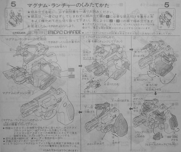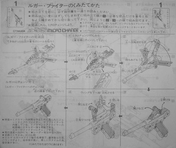 1980年代前半頃、カバヤミクロマンガムのミクロチェンジシリーズです。 上からルガー・ファイター、マグナム・ランチャー、ブローニング・ロボと なっており、これらには奇数の番号が、同時期のミクロカセット達には 偶数の番号がつけられてラインナップされていた様です。 弾は発射できませんが、小さなボディに詰められた変形ギミックが 大変魅力的なアイテムです。 |