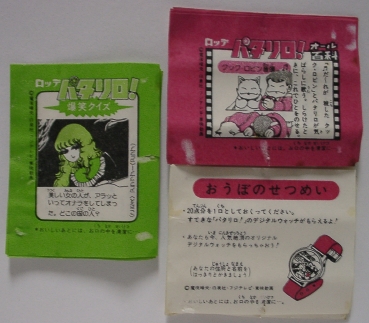 中の包み紙は、漫画の絵が流用されています。大体10巻ぐらいまでから チョイスされている様です。 シールは付いておらず、パタリロ!爆笑クイズと称するナゾナゾと、パタリロ! オール百科と称する微妙にソフトな表現による用語紹介が印刷されてました。 パタリロ!オール百科は以下の10種類がチョイスされていました。