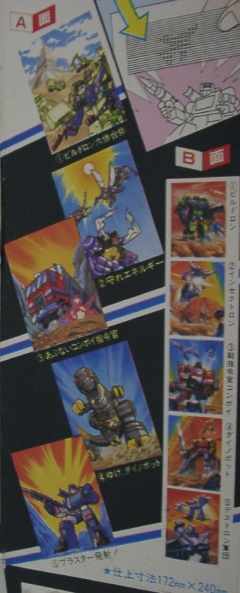 1985年頃、カバヤから出ていたトランスフォーマーのジグソーパズルです。 と言っても、中味はただ単に横にスライスしただけのパーツがキチンと順序良く 収められていたので、全然パズルじゃありませんでした。 もっとも、台紙がないのに複雑に裁断されてても、それはそれで困るのですが。