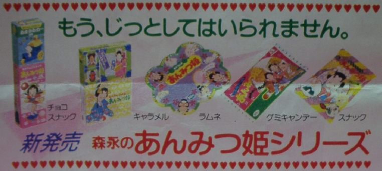 1987年頃のお菓子屋さんの袋です。 販促のためでしょう、両面に当時のラインナップが印刷されており、 あんみつ姫の商品の豊富さにはちょっと驚かされます。 ・・今見ると結構カワイイな。買っておけばよかった、チクショー。 |