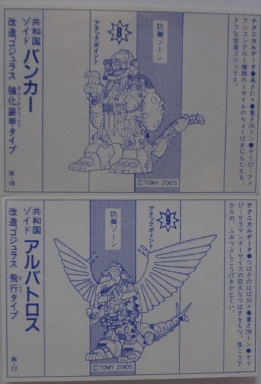上の写真にある、ゾイドウェファーチョコのパッケージとシール。 シールの裏面には、改造ゾイドのデータが記されています。 |