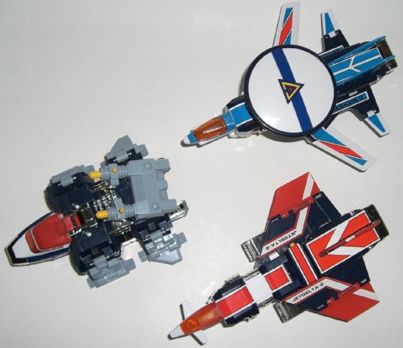 タンクコマンド-1、ジェットデルタ-2、ジェットシーカー-3。 これらのメカが個性的な合体をこなし、フラッシュキングになります。 それまでの戦隊には無かった、巨大なレーダードームを装備した ジェットシーカー-3の個性もなかなかのもの。 |